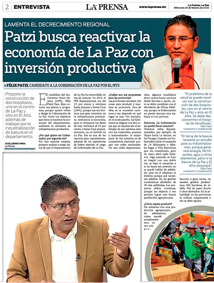 La producción agropecuaria a gran escala en el Departamento de La Paz es una necesidad en las 20 provincias del Departamento de La Paz, como informa el diario La Prensa (25-2-2026.