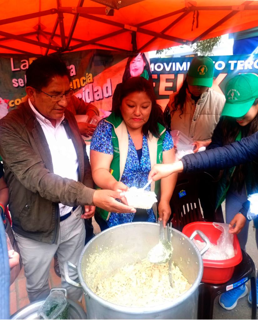 El candidato a Gobernador de La Paz, Dr Félix Patzi, junto a la postulante a asambleísta Pamela Salazar compartieron este miércoles 11 la comida paceña más popular: “Sopita de fideo” con estudiantes de la UPEA, caseritas, y vecinos que se acercaban, para conversar o sacarse una “selfie”.